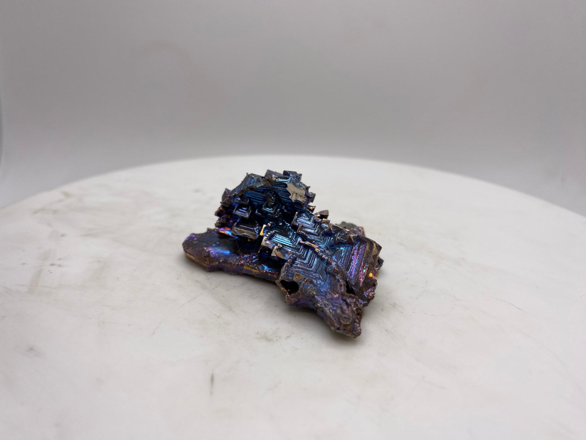 Makes for an even better paper weight, desk ornament or Christmas gift. These crystals have better patterns and are larger. The same bismuth that was heated to 2000° and shot with a waterjet, melted again and turned into a lovely crystal.